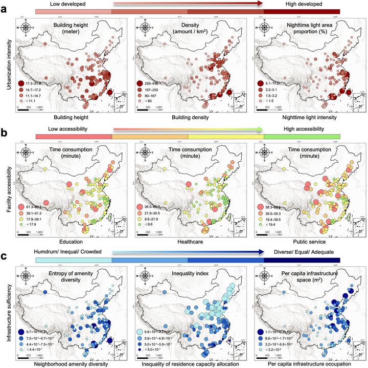 Multi-dimensional assessment of built environment disparities in 109 cities across China. Each row presents three indicators corresponding to one of the three dimensions at the national scale; legends are provided in the bottom-left corner of each map.