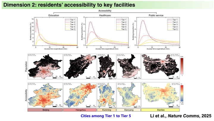 Tong’s abstract: China’s urbanization has unfolded at unprecedented speed—rising from ~21% urban population in 1978 to ~66% in 2024—while the benefits of growth have been unevenly distributed. This talk presents a deep learning approach to quantify urban inequality. First, I introduce a new national-scale, building-level map of urban functions in China, which classifies individual buildings into eight categories. The product fuses multi-source remote sensing, including night-time lights, high-resolution optical imagery, and building height, with training labels from existing points-of-interest and building footprints and validation using statistical records, yearbooks, and ground-sampled reference points nationwide, independently. Using these data, we quantify disparities in (i) urbanization intensity (height, density, lighted area), (ii) accessibility to essential facilities (education, healthcare, public services), and (iii) 15-minute living circles that capture neighborhood-level amenity diversity and convenience across city tiers and within-city gradients. Together, these analyses offer actionable insights for equitable urban planning.